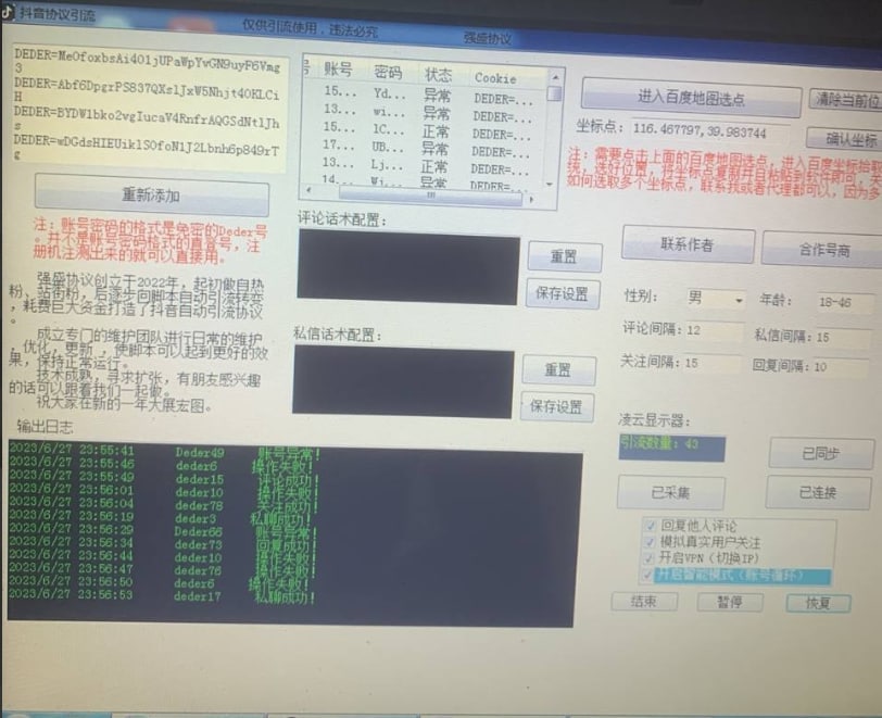 抖音免设备云控软件,适配抖音协议号token号ck号,批量操作